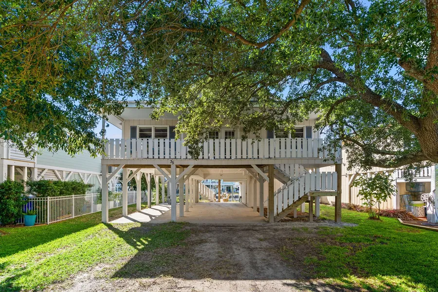 This is a RARE FIND! Nestled among majestic oak trees, this charming 4-bedroom, 2-bath beach cottage offers the perfect blend of coastal charm and laid-back lifestyle. Situated on a desirable canal lot with a floating boat dock, this raised beach home is ideal for boating enthusiasts or anyone seeking a serene waterfront lifestyle.