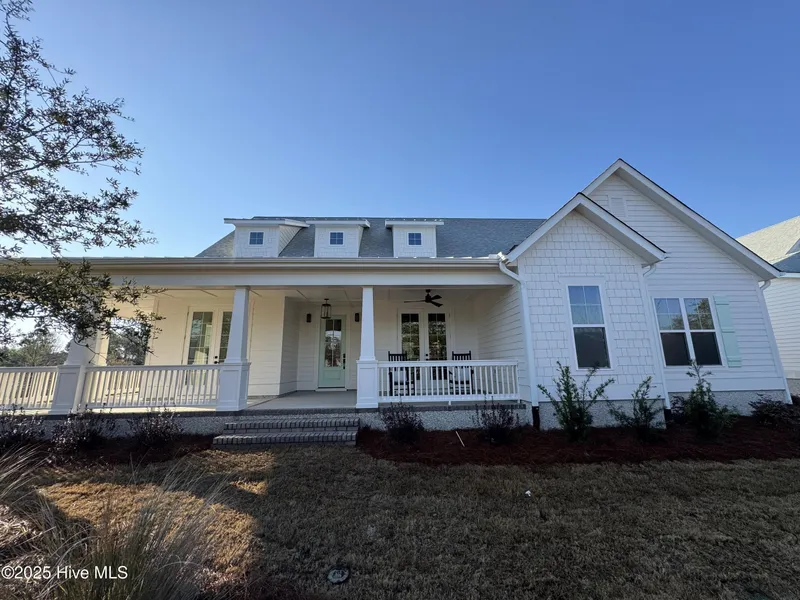 Legacy Homes by Bill Clark presents a custom spin on the showstopping Staley plan in the charming Meadow Park at Brunswick Forest. The Staley takes outdoor living to the next level with its beautiful wrap around front porch and over 40-foot of rear screened/covered porches. The Staley plan is thoughtfully designed with 3 bedrooms and 2.5 bathrooms on the first floor and a large finished bonus room and bathroom over the garage. The great room and kitchen feature an 11-foot coffered ceiling with built-ins flanking the fireplace. The kitchen is an entertainers dream with gorgeous calacatta gold quartz countertops, 36'' gas cooktop, built-in wall oven and microwave, french door refrigerator, Electrolux beverage center, and walk in pantry. The primary bedroom features a tray ceiling and french doors leading out to the rear covered porch. The primary bathroom is the perfect place to relax with a spacious zero entry tile shower and freestanding soaking tub. The Staley offers many upgraded finishes throughout including hardwood floors in the main living area, custom white wood shelving in all closets, wainscoting in the foyer and dining room, coffer ceiling in the dining room, wood stair treads leading to the bonus room, metal roof on the front porch, a tankless hot water heater, and many more!