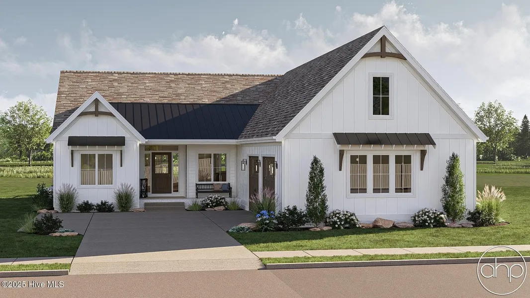 The Lakeland offers a beautiful modern farmhouse plan. The exterior features board & batten siding with a courtyard garage. At just over 1900 square feet, this plan is a great size for any family. Just inside the home, you'll walk into a large great room that is warmed by a fireplace with built-in bookshelves. The kitchen flows seamlessly with the great room & dining room in an open layout. The kitchen includes a walk-in pantry & a large island with built-in shelves. The primary suite includes his/her vanities, a walk-in shower & a large walk-in closet that accesses the laundry room. Bedrooms 2 & 3 share a centrally located hall bathroom. An optional finished room over the garage (FROG) adds 315 sq ft. Let's explore how this can be your new home!