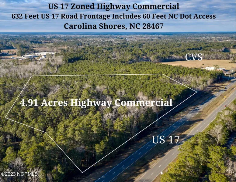 This is it! 4.91 Acres Zoned Highway Commercial on US 17 with 632 Feet of Highway Road Frontage that includes 60 Feet of NC DOT Access located in Carolina Shores, NC. According to a 2022 Census, Brunswick County is the fastest growing County in the State and an increasing choice for business investments. The Atlantic Ocean and the ICW are right in our backyard and make this area well known as a favorite vacation spot for tourists, 2nd Home Buyers, and Retirees. Our close proximity to Sunset Beach, Ocean Isle Beach, and the Calabash River with our Calabash Sea Food Restaurants draws tourists, golfers and families to our area to enjoy our Southern Lifestyle. Build on this land and you are located on US 17 just 1 Mile to South Carolina with Little River's only Casino Boats in SC, and the sandy shores of Cherry Grove Beach. Continue on US 17 to North Myrtle Beach and Myrtle Beach and the Grand Strand - long considered a Vacation Mecca! The Chamber of Commerce estimates 14 Million Visitors annually to the area. Multiple documents are uploaded in the MLS including Brunswick County Population Growth, Demographics, Planned Neighborhoods and Significant Projects from Brunswick County Planning Department for your use. There is a Lift Station on the property. The Town of Carolina Shores has offered to sit down with interested Buyers to discuss the possibilities for this property.