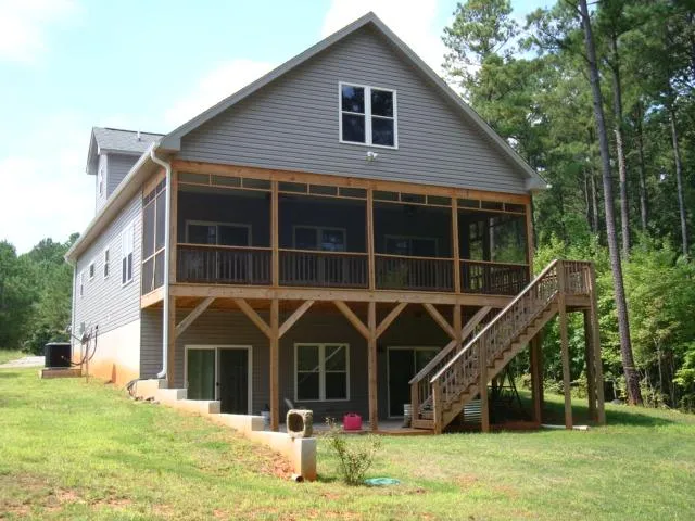 Almost new home with 3 BR and 2.5 BA. Master suite is on the main level with 2 bedrooms,1 bath in basement. Top floor has 2 bedrooms and 1 bath studded in with plumbing and wiring in place (4 BR perc). Main level has open floor plan with kitchen and dining area; walk out of either to get to the lovely screened porch. After your boat ride or swim, come into your walkout basement and enjoy a movie or games. Plenty of room to expand the home or have a garden space. Comes with a deeded boat house which is on Lot #7. House is being sold furnished. Just bring your bathing suit and toothbrush!!!