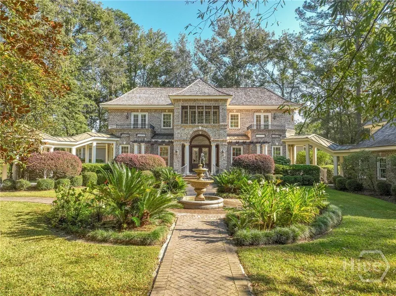 Tucked deep within the Ford Field & River Club, this estate feels like a private world of its own. A brick walkway winds through lush gardens and past a timeless fountain before guiding you to the home's gracious entrance. Step inside and the sunlit living room invites you in, opening seamlessly to the formal dining room, gourmet kitchen, and breakfast nook-spaces made for lingering conversations and effortless gatherings. The main-floor primary suite offers a quiet escape, while upstairs, two bedrooms each reveal their own private balcony with views of the beautiful grounds. Mornings are best spent on the screened-in porch, watching the third hole of the award-winning Pete Dye golf course come to life. A breezeway leads to a fully appointed guest cottage and a charming carriage house above the garage, creating a retreat that feels both timeless and perfectly complete.