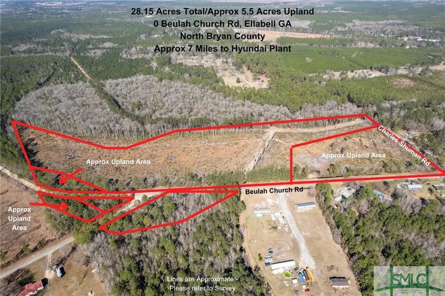 28.15 acres in total, with approximately 5.5 acres of upland, located on Beulah Church Rd at Charles Shuman Rd in North Bryan County, Ellabell, GA. The property is approximately 7 miles from the new Hyundai Meta Plant. This residential tract has several access roads (Hwy 280/Hwy 204/Hwy 67) and boasts approximately 1,402' of road frontage on Beulah Church Rd and about 450' of road frontage on the paved Charles Shuman Rd. The current zoning is RR-1, which allows for 1-acre lots with a minimum of 100' road frontage.