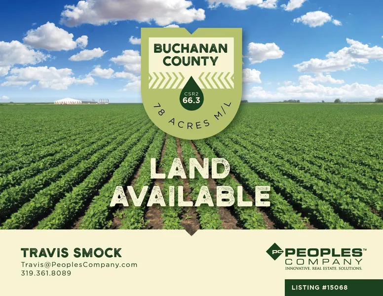 Peoples Company is pleased to present 78 acres m/l of Buchanan County farmland with an excellent return potential! This farm offers 70.82 FSA tillable acres with a CSR2 of 66.3. The pricing and size make this a great farm to add on to an existing operation, for a beginning farmer, or as a smart investment for the buyer looking to diversify their portfolio. This property boasts great yield history with a 220+ bushel average corn yield over the past three years. A wetlands determination has been complete and new tile was added in the spring of 2017. Timber and a small creek in the northeast corner of the property give the owner an opportunity for recreational use. Excellent fertility is provided in part by an ongoing manure easement from a new hog building adjacent to the property allowing the buyer to limit the need for commercial fertilizer. This land is situated just northeast of Aurora along the Buchanan/Fayette County boarder at the southeast corner of the Taylor Avenue/100th Street intersection in Section 5 of Madison Township, Buchanan County, Iowa.
