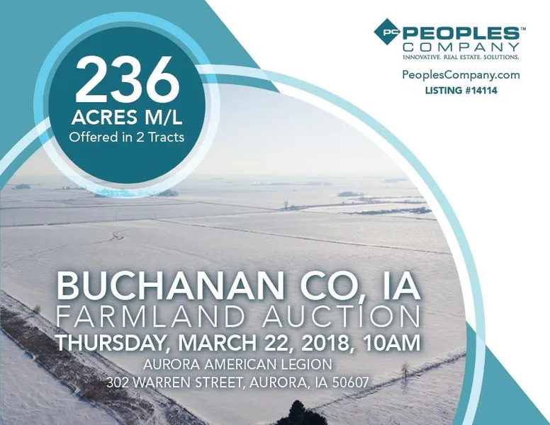 Offering 236 acres m/l of high quality Buchanan County farmland to be sold at public Auction Thursday, March 22nd, 2018 at 10:00 AM at the Aurora, Iowa American Legion. Auction will consist of two outstanding tracts with Tract 1 totaling 156 acres m/l and Tract 2 totaling 80 acres m/l. The Farms will be sold using the choice auction method with the successful bidder will having the choice to take one or both tracts. Both tracts are highly productive soils and well drained with outstanding yield potential.