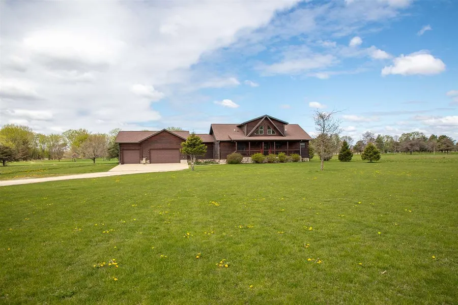 Taking backups, call Agent. A wonderful opportunity for retreat-style living in this gorgeous log-cabin home on almost 4 acres! This beautiful home showcases a sunny living room with vaulted ceilings, expansive windows, stone fireplace, and wet bar that is open to the dining room and kitchen. The kitchen has a large island with counter-height seating, solid surface counters and includes all appliances. Relax and take in the backyard from the 3-seasons porch or the deck. The main level master is like being on vacation with vaulted ceilings, fireplace, sliding doors to the deck, attached master bathroom with jetted tub and walk-in closet. The finished loft area showcases more of the log cabin charm. Conveniently located just off of the garage, the mudroom includes the laundry room, a half bath and lockers for extra storage. The lower level is ready for you to finish to your liking, but alr...