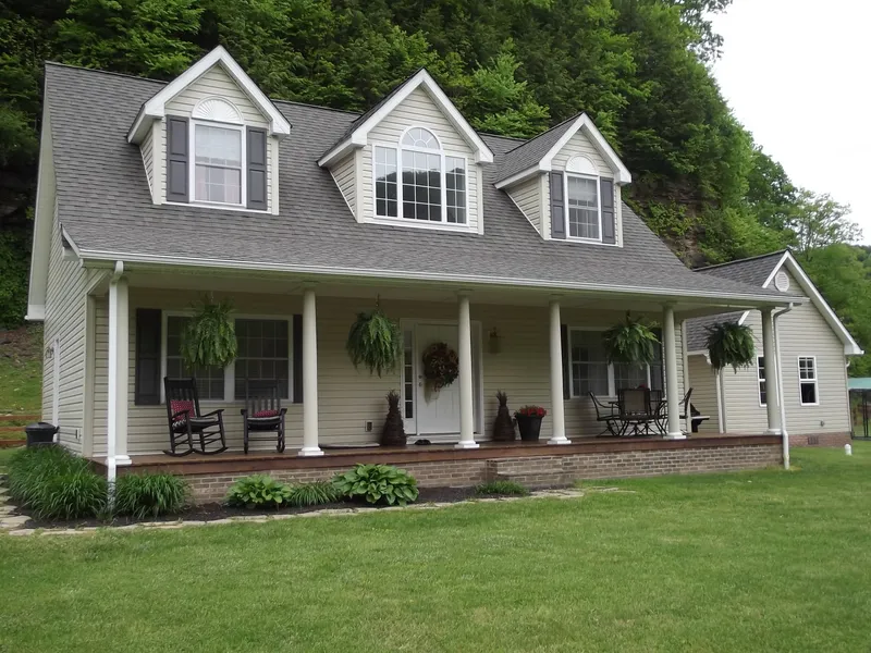 Welcome to your new home!!! This beautiful Cape Cod situated on top of this knoll has privacy & space indoor & out. Beautiful landscaped with apple, peach & pear trees to enjoy & a large garden area. Enjoy the mountain scenery & wildlife from the gorgeous 40x8 front covered porch; great for entertaining having coffee or enjoying the sounds of the creek flowing below. This is a custom built all American home (Kingston plan); hosting 3 bedroom, 2 full baths with the master on the main level, large kitchen & dining combination. You will enjoy & cozy up in the den with the corner fireplace at the front of the home. The kitchen has all stainless steel appliances & moen faucet with reverse osmosis water filtration, the Sundale maple toffee kitchen cabinets adds warmth to this entertaining area. The laundry is located off the kitchen with hookups for not one set but 2 sets of washers & dryers w...