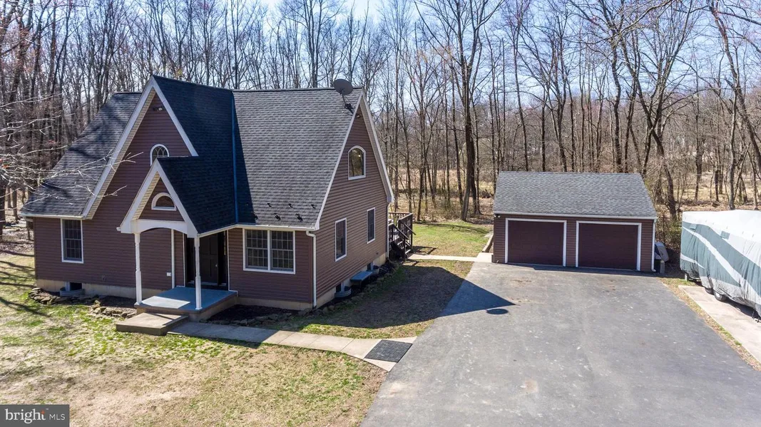 One floor living! Built in 2009 this well cared for home sits on 2.6 quiet acres in Upper Bucks County with easy access to the Delaware River, New Jersey and Doylestown. The main level with an open floor plan consists of a living and dining room area with hardwood floors and a generous kitchen with cork floor. There is a double door leading to the rear deck off the kitchen area perfect for entertaining and enjoying the private rear yard and woods. Two bedrooms and a hall bath complete the first floor. Upstairs is an open loft with vaulted ceilings, large windows and a sliding door to a small deck to enjoy nature from. This area is currently set up as a family room and sitting area but could also be used as a bedroom if desired. The lower level, with outside access, is set up as a gaming room with pool table and an office area. There is also a full bath and laundry room. Central Air will keep you cool in the summer and you can use the heat pump or the wood burning furnace to keep your utility bills low in the winter. A two-car garage, shed and plenty of parking for a boat or RV.