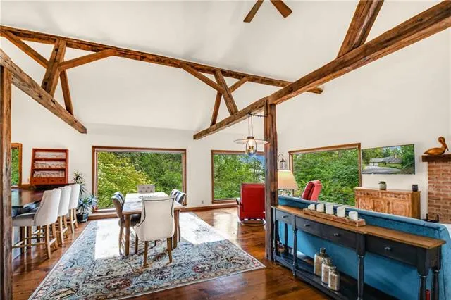 sold before processed ...This 4-bedroom, 2.5-bath retreat is a sanctuary for those who crave both comfort & a deep connection w/the great outdoors. Breathtaking views, every corner of this home is carefully thought out. The heart of HILL HOUSE is its Great Room, anchored by a wood-burning fireplace. Step onto the real hardwood floors & gaze up at the open wood-beamed ceiling. The kitchen boasts durable soapstone countertops complemented by a custom tile backsplash. The kitchen seamlessly flows into the open floor plan, making it the perfect hub for gatherings. Equipped with high-quality appliances, including a Bosch dishwasher, Broan range hood, Dacor microwave, & a new Sharp stove/oven, this kitchen combines form & function effortlessly. Main floor Owners' suite has been designed w/ comfort and privacy in mind. Custom-designed bathroom features a designer walk-in shower & a custom vanit...