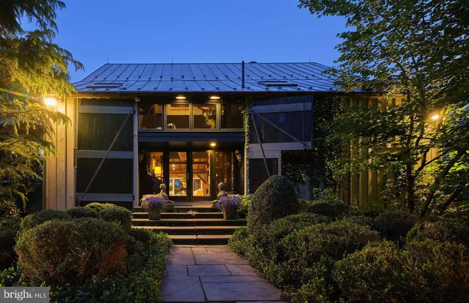 This stunning barn conversion seamlessly blends rustic charm with modern luxury. The barn and farmhouse date back to 1710. The character of the original barn has been carefully preserved featuring the original exposed beams and magnificent stonework. Upon entering the home, you are greeted by a spacious open and flexible living area with soaring ceilings and large windows that flood the space with natural light. There are also radiant heated hard wood floors throughout this level. This designer decorated home is available fully furnished. A beautiful bright gourmet kitchen boasts high end appliances, a large center island and lots of counter space and custom cabinetry. The living room is spectacular with a magnificent Rumsford fireplace at its center. There is also a large dining area surrounded by windows overlooking the gardens. This floor also has a well-sized office and a full bath. The stone walls, wood beams and radiant heated floors continue to the lower level featuring an amazing primary suite which includes a large bedroom, gorgeous marble bathroom with mother of pearl mosaic floors, glass shower and soaking tub. A dressing hall features rows of closets and there is a sitting/dressing room with beautiful lit cabinetry. A balcony works perfectly as a home gym overlooking a sunroom and double doors out to the pool and gardens. The second floor includes 2 guest suites and a full bath. The third floor has an interesting, cozy space for either an additional bedroom or home office. The home also includes a completely private one-bedroom guest apartment with a full kitchen, living room and deck overlooking the gardens. The apartment is accessible from either inside the home or through its own private entrance with an elevator. Step outside to discover the extensive lush gardens and mature trees, creating a peaceful escape. The expansive Blue Stone terrace with outdoor kitchen is ideal for seasonal al fresco dining while overlooking the swimming pool complete with eight fountain heads. There is also a koi pond with waterfall and magnificent illuminated gardens. A tennis/pickle ball court completes the outdoor amenities. The home is conveniently located with a wide variety of shopping and dining options minutes away. Drive time to Princeton is 20 minutes, 40 minutes to Philadelphia and 70 minutes to NYC while the nearest train station is a 20-minute drive. Behind the gated entrance, Eight Bells is truly a private oasis located in one of Bucks County's most prestigious/upscale towns. A perfect getaway retreat, this property promises a lifestyle of elegance and tranquility.