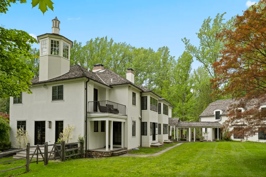 Transported into a World of Utmost Sophistication and Privacy- Prepare to be seduced by one of the finest estate homes in Solebury, "Birdsong", where understated grandeur meets impeccable craftsmanship. This exceptional residence—a masterful renovation by acclaimed interior designer Timothy Summers Bailey—has been transformed into a sanctuary of refinement and serenity. Swathed in creamy off-white tones, the interiors provide a tranquil, neutral canvas for showcasing treasured furnishings and art. Sophisticated Finishes & Thoughtful Craftsmanship Throughout- Every inch of this estate reflects a dedication to timeless design and elevated materials, blending old-world elegance with modern luxury. Rich ash flooring flows seamlessly throughout, while expansive windows and doors, installed in 2023, bathe the interiors in luminous natural light, amplifying the home’s serene ambiance. The journey begins in a breathtaking foyer that sets the tone for the home’s dramatic yet inviting interiors. To the left, an intimate parlor with fireplace transitions gracefully into a generous dining room, ideal for elegant entertaining or intimate gatherings. Beyond the foyer, a moody, atmospheric whiskey library with a wood-burning fireplace beckons for fireside conversations and quiet reflection. At the heart of the home, a soaring great room features a wall of windows framing views of the pool and lush grounds, dissolving the boundaries between indoors and out. This spectacular space flows effortlessly into the chef’s kitchen—a showpiece adorned with Carrara marble, bespoke cabinetry, and a striking Venetian plaster hood. A fully equipped butler’s pantry with a secondary dishwasher ensures effortless entertaining, while a walk-in pantry, chic powder room, mudroom, and media room complete the meticulously designed main level. Elevated Living Across Every Level- Upstairs, the private quarters offer a sumptuous primary suite with a spa-like bath wrapped in Carrara marble across the countertops and expansive shower walls, with Carrara mosaic tile underfoot. Custom white oak cabinetry elevates the space to a new level of indulgence. Two additional en-suite guest rooms, a dedicated office, and a designer-appointed laundry room complete the second level. The third level features an expansive en-suite guest retreat, providing exceptional privacy for extended stays. The lower level is designed for leisure and recreation, featuring an en-suite guest room, fitness room, secondary kitchen, and additional laundry—perfectly positioned for seamless poolside entertaining—alongside a full bath for added convenience. Resort-Like Grounds & Amenities- Extending the estate’s appeal, a charming guest house offers a private one-bedroom retreat with one and a half baths, full kitchen, a cozy fireplace, and an outdoor entertaining area designed for unforgettable evenings under the stars. Completing the property are a three-car garage, a picturesque pond, and a storage shed—all seamlessly integrated into the manicured grounds, delivering the feel of a private resort oasis. Every space within this estate is illuminated by carefully curated lighting fixtures, enhancing the sophisticated material palette and creating an artful glow that transforms the property after sunset into an enchanting, private world of your own. This seductive estate offers far too much to capture here and must be experienced to fully appreciate its rare blend of privacy, craftsmanship, and world-class design. Low taxes, property in ACT 319