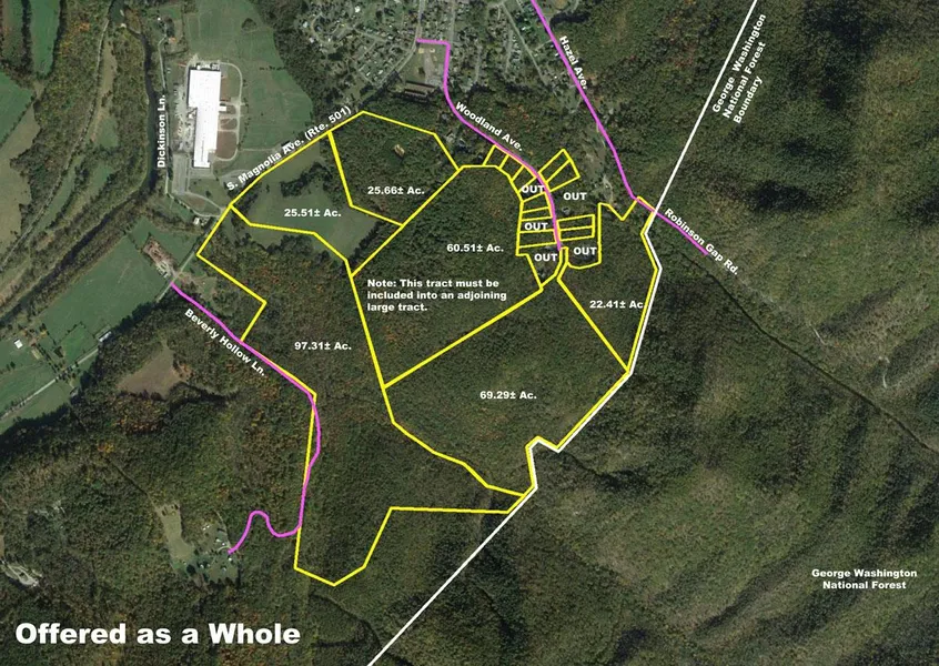 311 beautiful rolling acres Includes 10 one acre building lots offered as a whole. Magnolia Ave (Rt. 501) Across From Dickinson Lane, Buena Vista, home of Southern Virginia University. Property also fronts Woodland Ave. Only 5 min. to I-81 exit 188A, includes 10 developed building lots with public water and sewer, long public road frontage, long frontage along George Washington National Forest, valuable timber, public water/sewer in Rt. 501 and Woodland Ave., good network of interior roads, long range views of the surrounding Blue Ridge Mountains, beautiful rolling topography, ideal for commercial, agricultural, residential, and recreational uses.