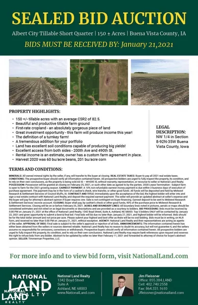 This auction will take place on January 21, 2021 at 5:00 PM.Location: Sealed Bid - Online or Mail-in Submissions.Plain and simple, this is a gem of a farm. Meticulously maintained over the years, this farm offers exactly what you'd expect - tillable land. Split down the middle, with crops popping up, it's half beans and half corn for the 2020 growing season. With an average CSR2 of 82.5, this is a HIGHLY productive farm. Fences line all 4 sides, clearly delineating between this farm and the neighbors. With its slight rolling hills, this farm is beautiful! Rental income is an estimate, owner has had a custom farm agreement in place.