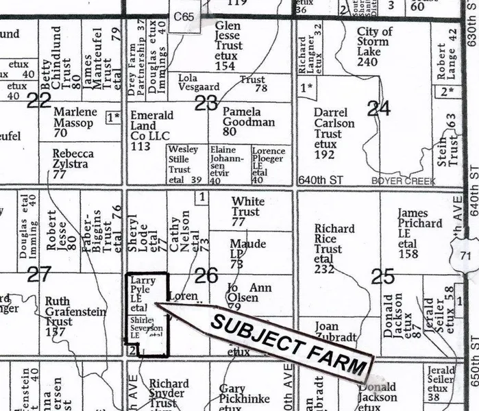 Research Parcel InformationFarm is located from the Intersection of Hwy. # 71 / Hwy. # 7 & C65 Southeast of Storm Lake, IA, 2 miles West on C65, 1 miles South on 110th Avenue; OR From the Storm Lake Airport, 2 miles East on C65, 1 miles South on 110th Avenue.