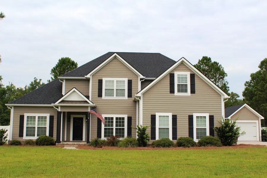 This home is ready for a family to move right in and enjoy! Very open plan from kitchen and great room. Foyer entry leads to great room and separate formal dining room. Kitchen has a breakfast bar and a large separate eat in area overlooking back yard, which backs up to the wooded area. Master bedroom is downstairs with separate his and her walk in closets, separate sinks and vanity areas, large tiled shower and separate garden tub. A guest suite with private bathroom is on the other side of the house, two bedrooms upstairs with the third full bathroom, walk in closets plus a large bonus room. Plenty of storage and walk in access to attic. Two car garage and a detached garage for lawn mowers and additional storage. Community pool, playground, and tennis courts.