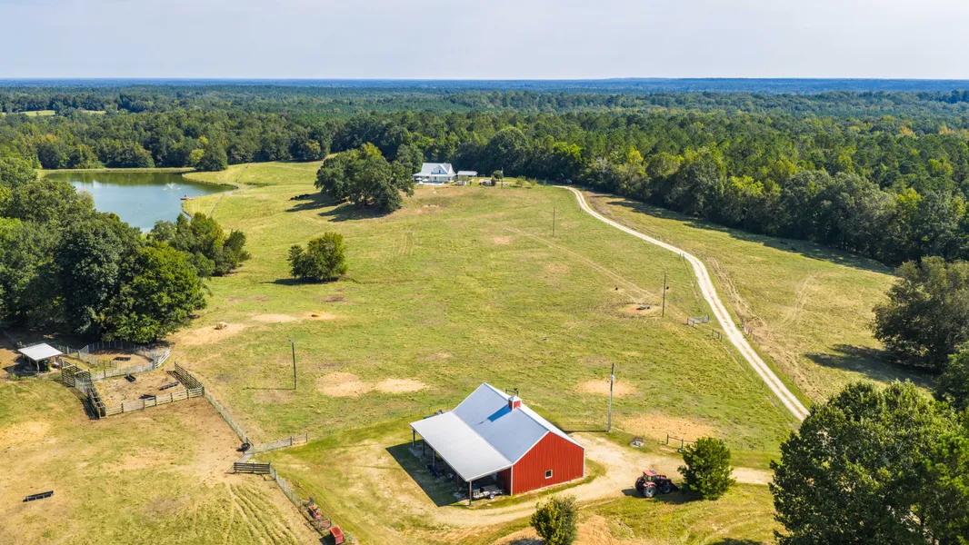 A striking 56’ x 32’ red metal barn with a cupola serves as both a functional centerpiece of the property and a charming secondary residence. Within it, a 1,000± sq. ft. barndominium provides comfortable guest accommodations with two bedrooms, two full baths, a complete kitchen, and a cozy den. Designed with practicality and comfort in mind, it is perfect for hosting friends, housing family, or offering privacy for a caretaker. The front porch of the barndominium captures immaculate views of the pastures and lake, making it a peaceful spot to enjoy morning coffee or evening sunsets while overlooking the landscape.
