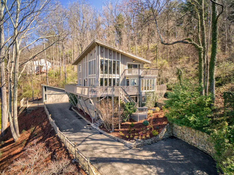 Less than a 5 minute drive to downtown Asheville, this contemporary home is nestled in a private setting just off Town Mountain Road. Home is very comfortable and inviting, with western views and lots of natural light streaming through walls of windows. Great place for family and friends to gather or a quiet cozy getaway just for you. Oversize garage perfect for small workshop. New kitchen renovation in 2017. The entire upper floor is an owner's retreat, complete with study and private deck.