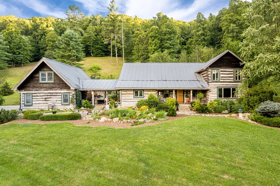 Authentic log cabin set on 48 stunning acres with year-round layered mountain views. The open floor plan design features a soaring vaulted ceiling with a stacked stone fireplace serving as the centerpiece of the home. The spacious kitchen features a large center island and granite countertops. Oversized master suite on the main level features double vanities, soaking tub, tile shower, and walk-in closet. A large loft space overlooks the living room providing ample space great for a bedroom or office. Second bedroom upstairs with full bath and walk-in closet. Garage apartment features a full bath, bedroom area, and loft/living space. All logs were sourced within the United States and are over 200 years old. Incredible outdoor living space with two covered porches and outdoor kitchen in the breezeway. The 48 unrestricted acres feature a bold creek, barn, and both cleared, flat land and woo...