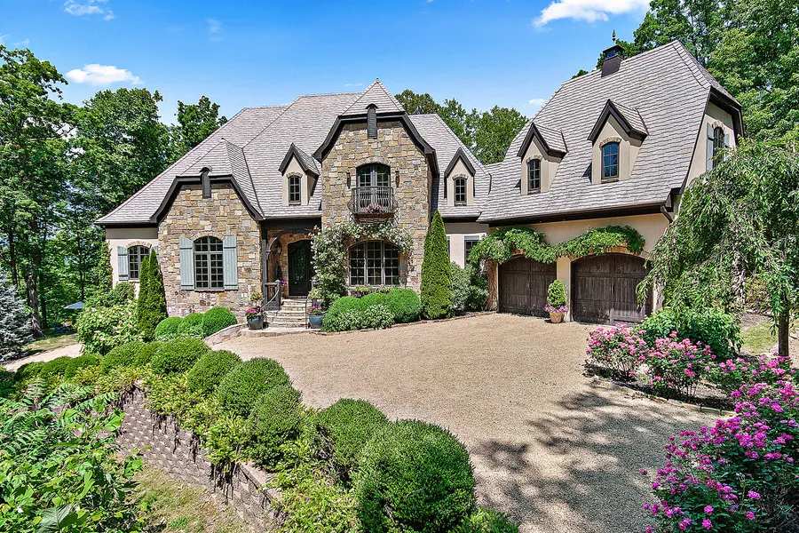 Just 15 miles to downtown Asheville, this home is inspired by the finest traditions of European architecture and design. This home is adorned with some of the finest finishes and treatments in our market. Positioned on a private mountaintop, 1.79 acres, and offers spectacular long-range views, complete privacy, and year-round gardens with additional acreage available on a full mountaintop. A French country kitchen with exquisite design, double island, hearth room, walk-in pantry, overlooking the majestic two-story great room with cast stone fireplace. Main level master wing, sitting area with 5 9ft turret windows, spa bath, and dressing area with private workout room. Each bedroom suite has access to a balcony. You will find a private cinema, lower wet bar, gym, dressing room, dazzling millwork, and walnut floors on two levels. Designed by award-winning architect Frank Snodgrass. Elevato...