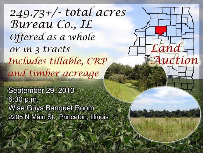 Land Auction Wednesday, September 29, 2010, at 6:30 p.m. at Wise Guys Banquet Room, Princeton, IL. Property offered as a whole or in the tracts. Mix of tillable, CRP and timber acreage.