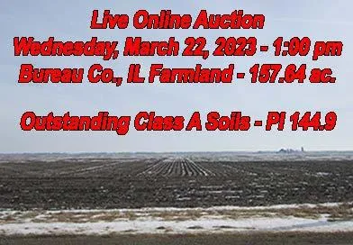 BUREAU CO., IL FARMLAND AUCTION on March 22, 2023 at 1:00 p.m. The J. Birney Brown Farm contains 157.64 total tax acres with 156.09 FSA cropland acres. Outstanding Soil PI of 144.9 with mainly Muscatune, Buckhart and Sable soil types. There is a lease in place for 2023, and the cash rent will be conveyed to buyer. The farm is being offered in 1 tract and sold based upon tax acres.