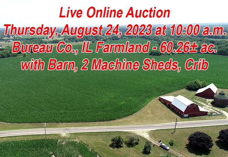 BUREAU CO., IL Farmland Auction - August 24, 2023 at 10:00 a.m. Virtual on-line only to be offered in 1 tract. The Larson Farm contains 60.26 total surveyed acres with an estimated 55.35 cropland acres (to be determined after reconstitution from the Bureau Co. FSA Office). Soil PI of 133.6 with mainly Greenbush and Atterberry silt loams. Improvements include a barn, 2 machine sheds and crib. All boundary lines are approximate. Real Estate Taxes include homesite and 8.5 acres previously sold and not part of this offering.