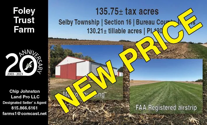 The Foley Farm is a unique 135 acre farm in Bureau County, Illinois that features an FAA registered lighted one-half mile airstrip that runs East to West. The property also has two nice Morton buildings and an airplane hangar along with 130 tillable acres in Section 16 of Selby Township and has a PI of 130.3 (Birkbeck, Catlin, Muscatune, Radford predominant soils).