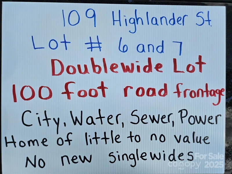 109 Highlander Street. Great doublewide lot. Very conveniently located to I-40, shopping restaurants lake James and all the attraction/amenities the Burke County has to offer. City water and sewer are available at the street. No new singlewides, new homes must be doublewides with primary entry on the roadside. 0.42 acre lot New Tap fee maybe required.