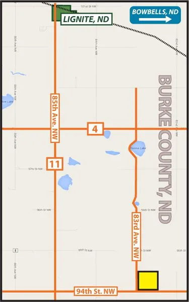 Driving Directions: From Bowbells, ND: Go south on Main Street and connect to 95th St NW and go 7.5 west and then 1 mile south on 78th Ave NW and then 4.5 miles west on 94th St NW. This will bring you to the southeast corner of the property. From Lignite, ND: Go 6.5 miles south on 85th Ave NW and then 2 miles east on 94th St NW. This will bring you to the southwest corner of the property.