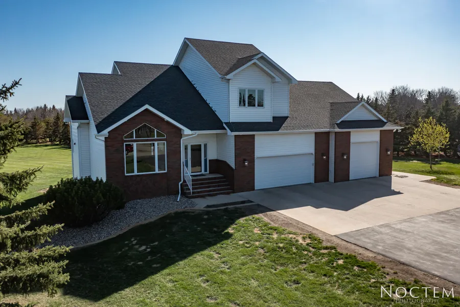 Beautiful private rural setting! Don't miss this majestic 1.5 story home in NE rural Bismarck with 3800+ Sf of living space and HUGE 1400+ SF garage/shop on +/- 2.13-acre treed, cul-de-sac lot. Grand entrance and living room open to the lofted upper level. Upstairs features one of three living/family rooms (or great home office space), full bathroom and two large bedrooms with vaulted ceilings. Main floor has large kitchen (three tall pantries, pull out drawer storage, under counter lighting) and breakfast bar, dining room with built-in hutch and access to the large backyard deck. Main floor master bedroom suite with double closets, master bathroom with soaker tub and separate toilet and shower room. Main floor laundry with cabinets and utility sink, half bath, and access to the garage complete this level. Lower level has 4th bedroom with double closets (currently used as an office), full bathroom, under stair pantry, large family/rec room with brick gas fireplace and built-in shelving (TV included), game room with wet bar, sauna, storage room with cabinets (safe negotiable) and utility room with workbench. Electrical outlets above hutch, kitchen and wet bar cabinets are switched. Home has steel siding and brick. Oversized 4+ stall garage is (1431 SF) with approx. 12' ceiling height, built-in storage, and heated shop with h/c water. Dog kennel off the back of the garage shop. Property is connected to rural water and has a well with 5-yard hydrants. Yard also features two garden spots, fire pit area, basketball hoop, Red Latham and Heritage raspberries, chokecherry, gooseberry, red and white crab apple, plum, flowering crab, oak, black walnut, and Haralson and Sweet Sixteen apple trees. Wildlife frequents the yard for nature enthusiasts! Call today to make this home yours!