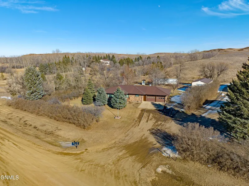 If you have been waiting for a great rural home on a private 10 acres, here it is! Just minutes north of Bismarck, this ranch-style home with shop has something to offer everyone! And you can bring your horses and other critters, too!! This home has so many updates! NEW 200 amp electric panel (2024), NEW shower surround in basement 3/4 bath (2024), and new Pella triple pane energy-efficient windows with blinds were installed in 2022. There is brand new carpet throughout most of the main floor and stairs to the basement! The main floor has been freshly painted in 2023, except laundry and bathroom which were also recently painted. The basement family room, bedroom & bathroom were freshly painted- as were the basement floors! There are many new light fixtures, plumbing fixtures and more throughout the home. The main floor offers a huge mudroom with 3/4 bath and main floor laundry! Want a master suite - you get creative and make the mud room a bit smaller and add a bath off of the south bedroom! The kitchen has great work space and the large dining room has access to the front porch. The spacious living room has room for all of your furniture. There are 2 roomy bedrooms on the main floor plus an updated full bath with tiled surround and linen closet. Step downstairs and you will find a huge family room with daylight windows and a gas fireplace (sellers have not used the fireplace for several years). There is a 3rd n/c bedroom plus an office and 3/4 guest bath new shower surround and tiled floors! The huge mechanical room offers great storage. The furnace is an electric Lennox Heat Pump System that was installed by the prior owners and is connected to offpeak electric. There is a well with new pressure tank & 2 house filters installed about 5 years ago. The water softener is also included! Sellers have estimates for connecting rural water if a future owner chooses to do so and those may be obtained from your REALTOR. 1,000 gallon propane tank for the house is owned and included. The home offers an oversized 2-stall attached garage with 2 service doors. If you are looking for additional parking and storage you will love the insulated and mostly heated 20X38 Eagle Span Shop with 12' overhead door and separate workshop area with built in cabinets!! The shop has 220 and its own 500 gallon owned and included propane tank! The home offers a front porch and rear deck for enjoying the outdoors and you will love the privacy offered by the trees! There is a storage unit on a new gravel pad that is included and a great garden area with trellis! There is also a firepit for adding ambiance to your evenings. The septic pump house shed is included. Exterior camera surveillance and 2 cameras in basement do not have audio and ARE included - no contract needed. The property is ready for you to set up for your horses! Call your REALTOR to schedule a private showing today!
