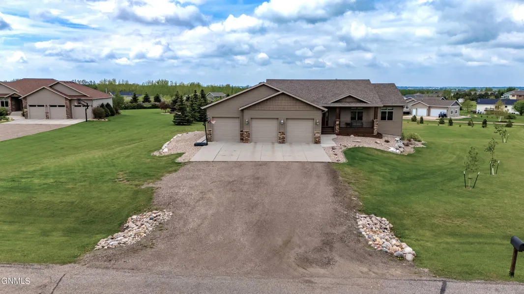 Located in rural NE Bismarck, this 5-bedrooom ranch-style home is in a cul-de-sac on 1.49 acres. Features include a sprinkler system, rock landscaping, many newer trees, maintenance-free decking on the covered front porch, large two-level deck on the back of the house & a walkout concrete patio area. The main level has 1,857 square feet with 3-bedrooms, laundry room, 3-bathrooms each with granite counter tops & custom designed mirrors. The bedrooms all feature large closets with built-in shelving. The kitchen features quality built custom walnut cabinets, spacious walk-in pantry, granite countertops, & a large island with seating. Commercial-grade vinyl plank floors flow into the living room & dining room which has space for a large table. The primary suite has a walk-in closet & a private bathroom with double sinks, large granite countertop, custom mirror, & tile shower. The walkout lower level has a big family room with a gas fireplace that has stone surround. There are 2 large bedrooms & a full bathroom with dual sinks, granite counters & custom mirror. Completing the lower level is an office, second laundry room, plumbing for future wet bar, & ample storage area. The oversized 3-stall garage is heated with a floor drain. Experience the best of both worlds at this exceptional rural property located close to north Bismarck.