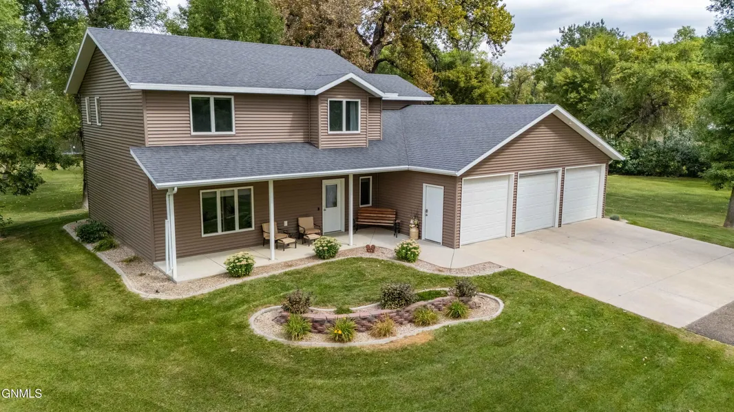 Serene living just minutes south of Bismarck! This custom built home was recently remodeled and is move-in ready! Enjoy the new kitchen with maple cabinets & granite countertops along with plenty of workspace and storage. The dining room has a walk out door to the secluded backyard and you will love to cozy up in front of the gas fireplace in the living room. There is a 1/2 bathroom on the main floor and a media room which is wired for surround sound! Upstairs you will find a spacious primary suite with walk-in closet and a bathroom featuring a jetted tub. In addition, are bedrooms 2 & 3 along with a full bathroom, laundry area and an office! The garage is over 1000 sq ft with in-floor heat, water, a split a/c unit, floor drains and a work area. If you need more space, the detached heated shop is 30 x 40! The lot has a sprinkler system, which is run off a well and with a large garden and playset, everyone is sure to fall in love with this home