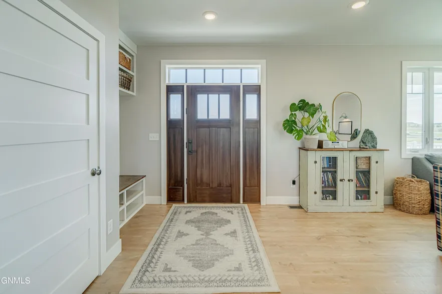 You will LOVE what you see this amazing home located in Rural NE Bismarck in Country Ridge Subdivision. This 2-story home offers 6 bedrooms and 4 bathrooms and an office. The impressive kitchen offers custom kitchen cabinets, upgraded appliances, pantry, quartz countertops and generously sized center island. Adjacent to the kitchen is an office w/ barn doors for privacy and windows facing the east. The open living room and dining room offers a gas fireplace and easy care flooring throughout. The patio doors off the dining room lead to an expansive maintenance free deck with natural gas hook up & overlooks the beautiful landscaped yard w/ flagstone concrete curbing. Tree rows planted with Colorado blue spruce, black hills spruce, ponderosa pine, amur maple and red cedar trees with drip irrigation system There is a 1/2 bath and walk in closet just off the garage. Take the steps to the upper level and you will see 4 desirable bedrooms on this level including the primary suite w/ a sizeable vanity w/ dual sinks, walk in closet and a sitting area w/ another electric fireplace and storage or fitness room. Laundry is also located on this upper level and full bathroom w/ linen closet & large vanity with dual sinks. Downstairs the comfortable family room features a custom built shiplap entertainment center w/ surround sound and daylight windows. There is an additional bedroom, full bath and storage/ utility furnace room offering aprilaire humidifier ,sump with radon mitigation system, hot water recirculation line and high efficiency furnace. The Triple garage offers 2 floor drains, water, heated, insulated, 12 ' ceilings and there is a parking pad alongside the garage with a 30 amp plug in. Numerous updates include Class 4 shingles, triple pane windows, 408 finished sq ft for a workshop or weight room right off the garage. See this one today!