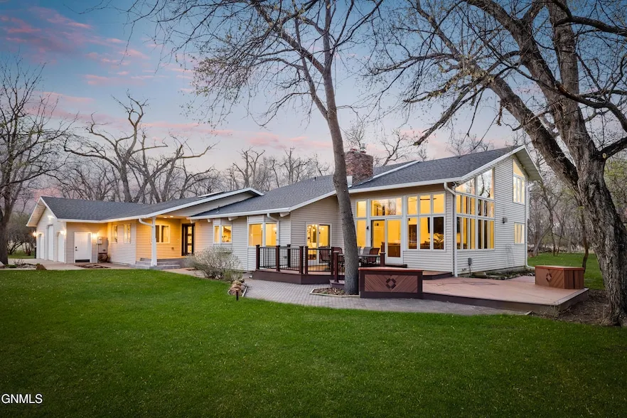 Rare opportunity to own a stunningly updated home offering luxury and privacy nestled on almost 4 acres just moments from downtown. Surrounded by mature trees, manicured lawns, vibrant flower beds, and a fully irrigated vegetable garden, this home offers a tranquil, park-like setting with shared neighborhood walking trails just steps from your backyard. Built for both comfort and longevity, this home features durable steel siding, a brand-new roof and gutters (2024), and countless upscale enhancements throughout. Inside, you'll find modern laminate flooring installed throughout the entire home, along with fresh paint and refined finishes. The main level is anchored by a showstopping great room with 19-foot vaulted ceilings, exposed beams, and a custom fireplace hearth. The adjacent chef's kitchen is designed to impress with a 10.8-foot granite island, LaCornue gas range with double ovens, quartz countertops, stainless steel appliances, microwave drawer, and a cozy window nook. Step out onto the two-tier Trex deck, now with updated railings and built-in gas piping perfect for outdoor dining or summer gatherings. The nearby living room features two-story windows, vaulted ceilings, a second fireplace, and a handcrafted wood storage bench that adds both warmth and artistry. The main level offers four generously sized bedrooms and two additional bonus rooms ideal for a home office, gym, studio, or guest suite. You'll also find a hall bath, a functional mudroom/laundry space, and a full spa-like bathroom with granite vanity, walk-in tiled shower, soaking tub, and heated floors. Upstairs, the private primary suite spans the entire level and has been completely re-imagined. With vaulted ceilings, new east-facing windows, exposed beams, and additional insulation for year-round comfort, this space offers room for a seating area or reading nook. The suite also includes a large walk-in closet and an elegant bathroom with cultured marble countertop, soaking tub, walk-in tiled shower, heated floors, and a second laundry area. Modern utility upgrades include a reverse osmosis water filtration system, whole-home water softener, and a modernized crawlspace (2016) with transferable warranty for added peace of mind. Outside, enjoy a peaceful, private lifestyle surrounded by lush greenery and a deer-protected garden with irrigation. Just minutes away, General Sibley Park offers a boat launch, disc golf course, and scenic walking paths perfect for weekend adventures. An attached 3-stall garage and a detached 2-stall garage offer extensive storage and workspace. This impeccably updated home offers the perfect combination of luxury, comfort, and modern design move-in ready and just minutes from everything Bismarck has to offer. Don't miss your chance to own this one-of-a-kind retreat schedule your private showing today and and see what makes this property truly unforgettable.