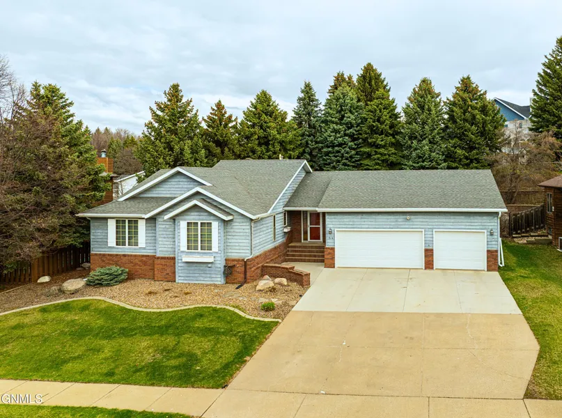 Ranch-style home located in NW Bismarck in one of the area's most sought-after & well-established neighborhoods. The main level has a custom designed floor plan featuring a large kitchen with a 2-tiered granite counter with seating, durable oak cabinets with ample cabinet storage space, tile backsplash, stainless steel appliances, & laminate wood floors extending into the dining room. The 3-panel glass patio doors provide great natural light for the dining room which can accommodate a large table. Adjacent to the dining room is a den with a gas fireplace which is surrounded with white brick including a brick mantel. French-doors open into the spacious living room. The primary bedroom has a 3/4 bathroom, makeup counter, & a walk-in closet. Completing the main level is the 2nd bedroom with a walk-in closet, full bathroom room with granite countertop & sky light, & a half bath/mudroom area located off the garage entrance. The lower level has a big family room, storage room, bedroom with large closet, full bathroom, & a utility room with great storage space. The 3-stall garage is heated & has a floor drain. The yard is fully fenced with an underground sprinkler system, rock landscaping, concrete edging, maintenance free deck, tiered rock wall, & established trees offering privacy. Great opportunity to own this south facing ranch style home with $0 in special assessments.
