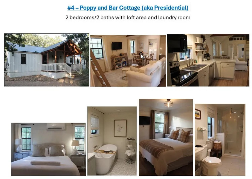 Cottage #1 - 2 bedroom/2 baths with a laundry room; Cottage #2 - 1 bedroom/1 bath with a loft area and twin bunk area; Cottage #3 - 1 bedroom/1 bathroom; and Cottage #4 - 2 bedroom/2 bath with loft area and a laundry room. Great investment property with the potential to add more cottages.