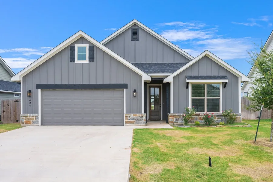 Why wait for new construction when this nearly new home is move-in ready? One of only a handful built in the Grand Lake of Snook Subdivision by Stonebrook Homes, who's builder has 43 years of experience in the industry, this 3 bed, 2 bath home offers the perfect blend of style, function, and convenience, without the hassle of construction delays. Step inside to find an open layout with raised ceilings, designer lighting, and durable vinyl plank floors. The kitchen is both beautiful & practical, featuring granite counters, large island, pantry, & generous cabinet space. The primary suite offers a soaking tub, tile shower, and a spacious closet. Out back, enjoy a fully sodded yard & covered patio with built-in prep sink, great for relaxing by the pond. Additional perks include a mud bench, LED lighting, & oversized 2-car garage. Located just 15 minutes west of Kyle Field, this home offers ...