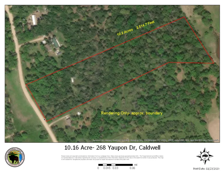 Research Parcel InformationComing from Caldwell. South on 21, Right on Yaupon. Almost a quarter mile on your right.