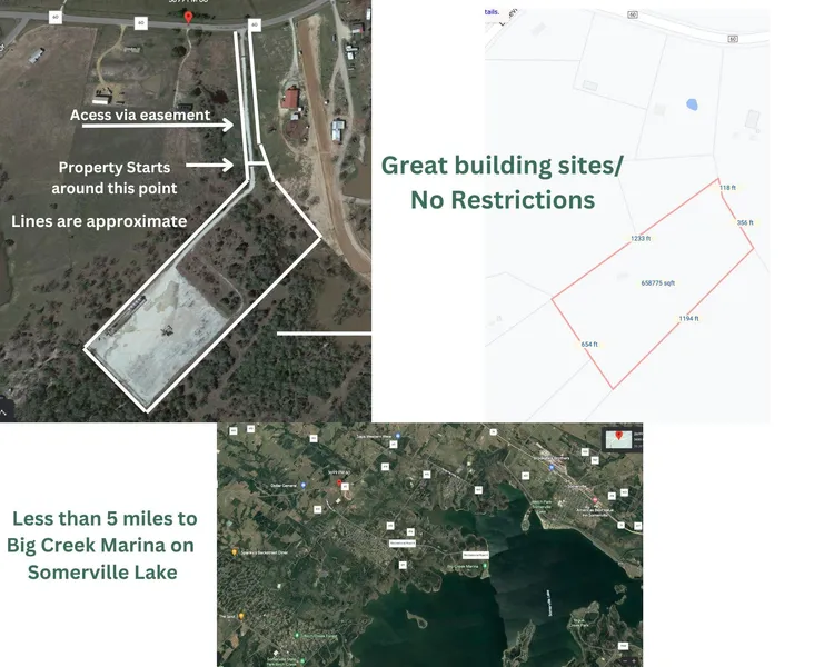 15 ACRE PROPERTY! Less than 5 miles to Big Creek Marina on Lake Somerville. Close to shopping, restaurants, and Somerville State Park and Trailways. Approx 1.5 hours to Houston TX and Approx. 1.5 hours to Austin, TX. No known restrictions. Beautiful building sites. Beautiful large trees. Electricity on the property. Seller believes the property is fenced on all sides. Seller owns the surface rights; upon contract close the surface rights will transfer to the new buyer. Seller does not own the mineral rights. Property has a drilling rig in place with an approx 7 acre pad. If a survey is needed the buyer will purchase.