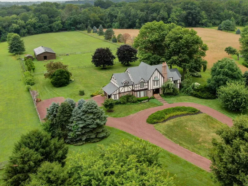Situated off the road on the most natural of settings you will find this grand four bedroom 2.5 bath traditional English Tudor style home. Green Vase Zelcova trees line the circular driveway. Cross the threshold through the solid, handcrafted Brazilian mahogany wood door. Experience the openness and admire the craftsmanship of the crown moldings and woodwork throughout. The formal living room hosts cathedral ceilings with exposed beams, a visible balcony to the second floor, and a wood burning fireplace. The dining room offers an oversized bay window. The eat-in kitchen is equipped with a center cooking island, granite countertops, stainless steel appliances and a bay window that overlooks the farm and flower garden. Just off the kitchen is the family room and office, with wide plank oak floors and plenty of natural light. The family room has atrium doors that lead to the natural oasis o...