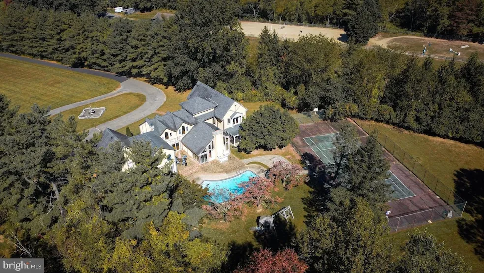 Exquisite Tudor-style estate spanning 6,150 sq. ft. and set on 7.24 private acres along its own road, Nina Drive. Nestled within the highly sought-after Moorestown school district, this distinguished property features a three-car garage, wrap-around driveway with fountain, partially fenced front yard ideal for animals, a picturesque pond, expansive wooded backyard, in-ground pool, tennis court, custom fire pit area with lighting, charming courtyard off the kitchen, and a separate carriage house. Inside, rich custom wood crown molding accentuates the Tudor design, infusing each room with timeless character and warmth. Stained-glass windows, instant hot in the kitchen, a full-sized liquor cabinet, and a grand two-story foyer with cathedral ceilings, new flooring, and fresh paint set a captivating tone. A floor to ceiling all stone, wood-burning fireplace in the sunken living room anchors the main living space, adding cozy, efficient heat, while a library loft overlooks a stately study off the entryway. The exceptionally spacious main-floor primary suite offers direct pool access, a private sauna, multiple closets, and an expansive wardrobe suite with a luxurious bath and seating area leading conveniently to the laundry room and laundry chute. Upstairs, a junior suite showcases graceful, long round-top custom windows that bathe the interiors in natural light and highlight the home s refined architecture. A spacious additional living area on the main level includes a private entrance, ensuite bath, and walk-in closet ideal for guests or extended family. This rare property blends elegance, privacy, and timeless sophistication in one of Moorestown s most prestigious settings. More than a residence it s a lifestyle, framed by stunning sunsets to close each day. This property may also qualify for farmland assessment, subject to local zoning and agricultural use.