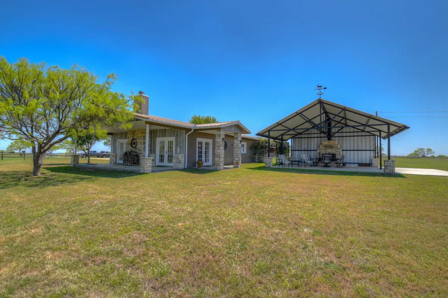 The lovely ranch home was built in 2005 and is 1,560 square feet with two bedrooms and one bathroom. The homes modern kitchen is just one part of the expansive, open living space of the home, separated from the dining and living space by a long island bar. This open space features a rock fireplace and rock accents with three sets of French doors leading to the covered patio area of the home. Just behind the home is another giant covered patio area, open on three sides, featuring an outdoor fireplace and ceiling fans. This is the perfect spot for entertaining guests and enjoying a beautiful Hill Country sunset. Nearby is the horse barn with three horse stalls, a storage area and workshop, and a deer processing area. A split rail fence extends past the home and barn, and there is a covered dog run between the house and barn.