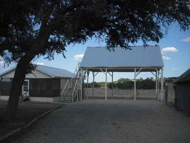 43.29 ACS & AWESOME HILL CO VIEWS * Ag exempt and cleared of cedars plus a beautiful home site on the hill. Small 1/1 cabin w/bonus room, screened porches front & back providing plenty places to sit and relax while building your dream home! Outside shower, storage above the lg carport, working barn & high fencing make this a must have for someone wanting acreage set up for animals. Owner will consider negotiating furnishings & animals that will help you keep your ag exemption.
