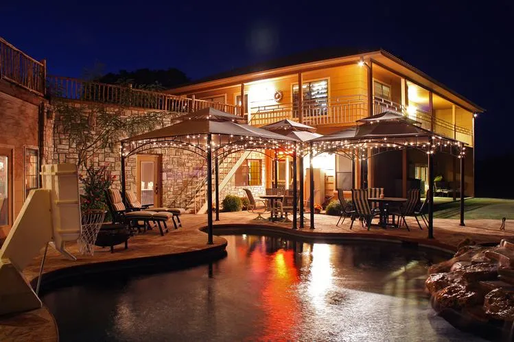 A spacious custom designed bar and game room also offers plenty of room for family and friends. Heres where you will find the pool table, air hockey, built in cedar bunk beds that sleep 8, custom built bar stools with seating for 8, custom cabinets and lighting, casual dining, TV, and all kinds of relaxed living features!