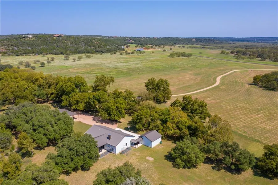 Escape to the hll country on this nearly 25 acre hideaway in beautiful Marble Falls. This contemporary farmhouse offers 4 bedrooms, 3 full baths plus study with large bunk/gameroom upstairs. The huge kitchen island, open concept and outdoor living/cooking space are perfect for large gatherings. Home features gorgeous stained concrete floors, large walk-in showers in all baths, covered back patio and walk-in pantry/wine grotto. Detached workshop/mancave has a separte downstairs 1 bedroom, 1bath apartment. Nestled amonst plentiful oaks and backing to Dry Branch creek in the gated community of Stone Mountain and located north of Marble Falls near several lakes and the incrediable ameniites of the hill country - golf, hiking, boating, fishing, wineries and more! Low tax rate and currently wildlife exempt.