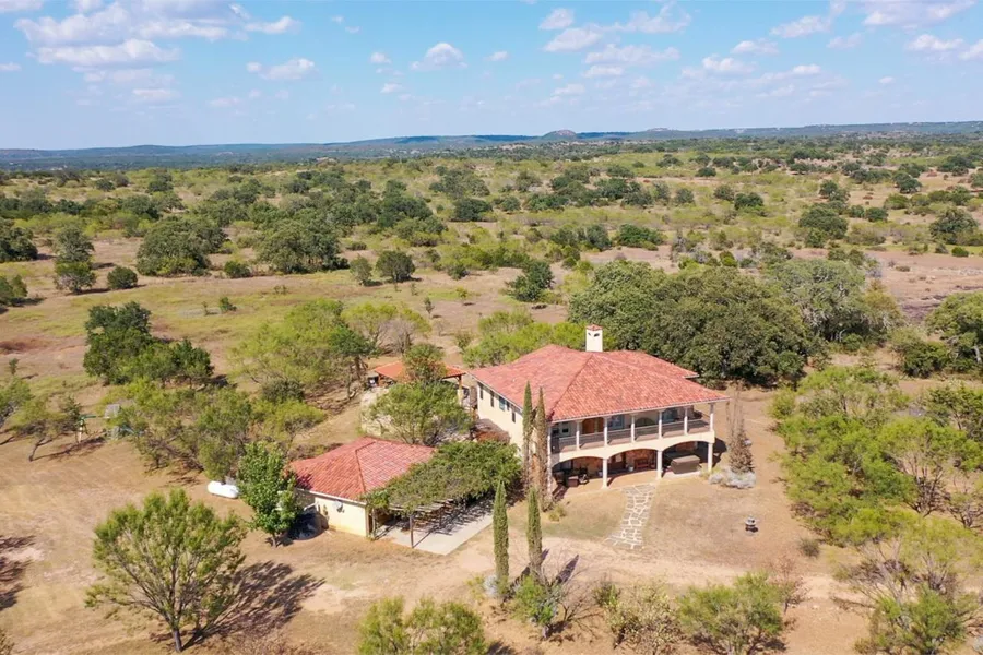 Welcome to country living at its finest! Bella Vista Estate is in a private gated community with all the safety and serenity offered by country living and only minutes from restaurants, coffee shops, grocery, and medical facilities. The 4 bedroom, 4.5 bath home is set on 10 fully fenced acres with expansive Texas Hill Country Views. The property also includes a detached 3 car garage, workshop, and horse barn. The beautiful open living area is perfect for entertaining family and friends or just relaxing with a good book. Floor to ceiling windows, massive stone fireplace, mesquite wood and tile flooring provide a soothing atmosphere. Enjoy your favorite beverage from any of the upstairs balconies or from your large flagstone patio complete with stone fire pit and covered pavilion. Wildlife Exemption provides lower property tax.