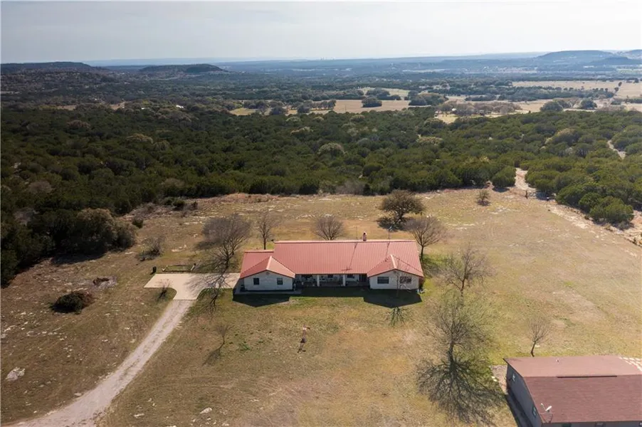 The High View Ranch gives you breath taking 20+ mile views of the surrounding Texas Hill Country. Partially fenced. Very secluded hill top home at the end of a Private Drive. The Limestone Home with Metal Roof was built in 1997. It has been well maintained by the one and only owner! None-Smoking Home! Centrally located limestone fireplace to warm your evenings in this cozy, secluded home on the hill. Large open kitchen, ideal for when you entertain guest on the back porch enjoying that big beautiful view as the sunsets in the West. Having a two car garage and 3 bedrooms, 1 office study, 2.5 bath, gives ample room for family or guest. A quaint wooden guest house, that was built in 1985, has two bedrooms, kitchenette, full bathroom and storage, sits a little over 100 feet from the main home. Free standing 2 car garage/barn, with storage area with the water well room. The owner has said the water well has been sufficient for their needs. No record of the well has been found. Garage/Barn sits a little over 200 feet from the home with large old Oak Trees. Cattle pens are sits behind Garage/Barn. This property is Unrestricted & Ag Exempt.