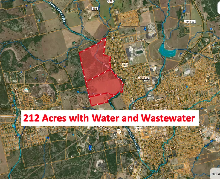 Rare Find in the Texas Hill Country. 212 Acres Within the City Limits of Burnet Texas with Water, Wastewater, and Capacity for residential development. Hamilton Creek borders the east portion of the property, with the 51 Acre Haley Nelson Park boarding the south, providing the perfect canvas for hike and bike trails and extending the amenities of the City Park for any type of residential community.