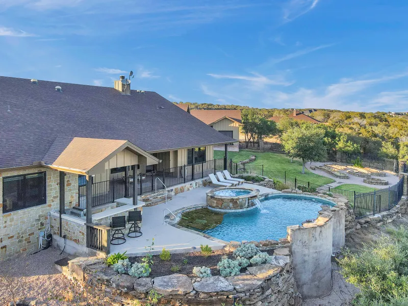 Welcome home to one of the most scenic neighborhoods in the Texas hill country. Perched atop the Stone Mountain community, this ranch-style home has it all: an expansive 4 bed 3.5 bath main living space, an oversized detached 6 car garage with a freshly renovated game room above, and a detached temperature controlled office or work space with a conjoining shop. Step out onto the back veranda to panoramic hill country views complete with an outdoor kitchen and a custom stone waterfall to accent the pool and hot tub. The 4.5 acre lot is set with extensive stonework, lush landscaping/ complete irrigation system, and custom raised garden beds that add to the incredible country views. But, it doesnt stop there; the home also has an independent well system, reverse osmosis water system, UV light and water softening system, foam insulation, smart lock entry on all exterior doors, a 750 gal prop...